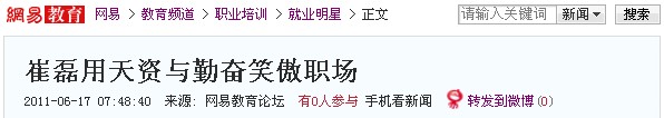 雖然崔磊只有20歲,但他已經擁有可以在社會上立足的資本,IT行業有了他的一席之地。現在的崔磊和李開復、李想等人還相距甚遠,但身為90后的他更年輕,有更多機遇和挑戰,有更光明的未來。國學大師季羨林說過:“一個人要成功只需具備三個條件足矣,天資、勤奮、機遇”。現在,他正帶著自己的天資和勤奮,在IT業一路凱歌,他只需牢牢抓住他人生中一次次稍縱即逝的機遇,就可以成就美好的明天。