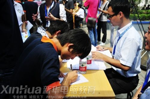 前來(lái)應(yīng)聘的新華學(xué)子正在填寫錄用表格