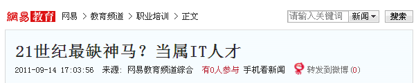 網(wǎng)易教育訊:21世紀(jì)是信息的時(shí)代 ,IT應(yīng)用觸及社會(huì)每一個(gè)角落。 金融 、電信、 電子商務(wù)、歐美及對(duì)日軟件外包等行業(yè)和領(lǐng)域的迅猛發(fā)展 ,毋庸置疑會(huì)帶來專業(yè)軟件開發(fā)人才需求數(shù)量的大幅增長(zhǎng)。同時(shí)隨著我國(guó)互聯(lián)網(wǎng)行業(yè)的全面復(fù)蘇以及網(wǎng)絡(luò)應(yīng)用在更高層次上的大規(guī)模展開,我國(guó)的網(wǎng)絡(luò)人才需求也在全新的層面上逐步呈現(xiàn)了出來。