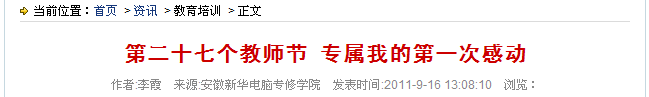 第27個教師節來臨之際,安徽新華電腦專修學院校園內熱鬧非凡,在這里全院學子用各種表達方式來對恩師的謝意。教師節當天記者就見到同學們為老師送上溫情的康乃馨以及節日的祝福,表達對恩師的感謝,收到學生的祝福和鮮花,老師們個個洋溢著幸福的微笑。