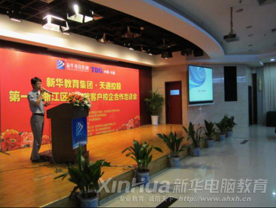 隨后,部分院校代表、合作企業代表就各自的優勢和人才供求方面作了展示和宣講。安徽新華電腦專修學院副院長王勝作為學校代表在會上發言,他分別展示了安徽新華目前的辦學規模、辦學實力、專業設置以及多年來所取得的成績,充分肯定了新華職業教育的發展成果,并且分析了我國目前職業教育的發展現狀,強調了“校企合作、工學結合”的人才培養模式,是深化職業教育教學改革,提高教學質量的關鍵。