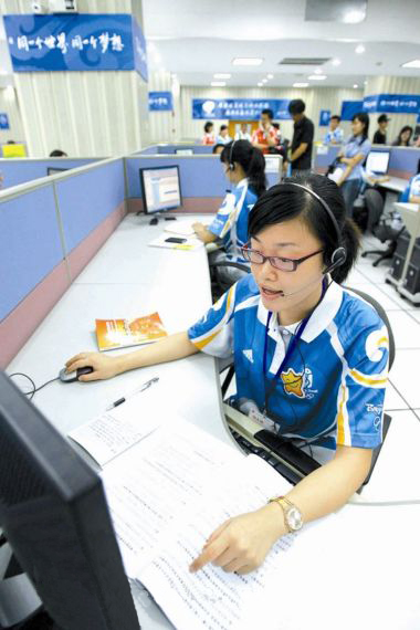 呼叫中心奧運味兒十足走進了呼叫中心辦公區,記者看到,印有祥云圖案的深藍色隔板圍成的工作間首先映入眼簾,墻上錯落有致地掛著印有中國印和志愿者標志的展板,身穿藍白相間,印有祥云圖案T恤的志愿者們在工作間里聚精會神地工作著。