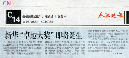 2006年3月4日,“新華·微軟MLC1000萬(wàn)元”獎(jiǎng)學(xué)金,卓越大獎(jiǎng)?lì)C獎(jiǎng)典禮將在合肥隆重舉行。屆時(shí),奮斗在全國(guó)的“卓越新華人”將齊聚廬州。