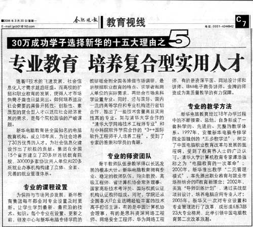 3月20日,《合肥晚報》教育視線版報道“30萬成功學子選擇新華的十五大理由之五——專業教育 培養復合型實用人才”的新聞并做了詳細報道,敬請關注!