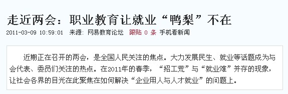 近期正在召開的兩會,是全國人民關(guān)注的焦點。大力發(fā)展民生、就業(yè)等話題成為與會代表、委員們關(guān)注的熱點。在2011年的春季,“招工荒”與“就業(yè)難”并存的現(xiàn)象,讓社會各界的目光在此聚焦在如何解決“企業(yè)用人與人才就業(yè)”的問題上。