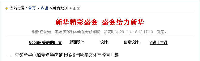 2011年4月16日,安徽新華電腦專修學院“數字給力、精彩你我”第七屆校園數字文化節在365西校區隆重拉開帷幕。學院領導、各部門負責人以及學院近千名師生一同參加了本次開幕式。
