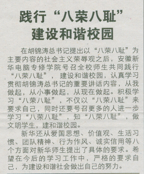 安徽新華電腦專修學(xué)院在胡錦濤總書記提出以“八榮八恥”為主要內(nèi)容的社會主義榮辱觀之后,號召全校師生共同踐行“八榮八恥”, 建設(shè)和諧校園,認(rèn)真學(xué)習(xí)貫徹胡錦濤總書記的重要講話內(nèi)容,從我做起,從小事做起,從現(xiàn)在做起。積極學(xué)習(xí)“八榮八恥”,不僅以“八榮八恥”來要求自己,同時還要號召更多的人進(jìn)一步學(xué)習(xí)“八榮八恥”,知“八榮八恥”,做文明學(xué)生,建和諧校園。