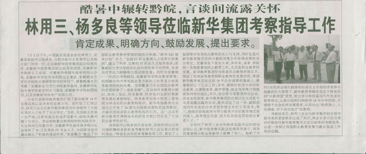 7月4日,《安徽商報》報道:“林用三、楊多良等領導蒞臨新華集團考察指導工作”的新聞,敬請關注!