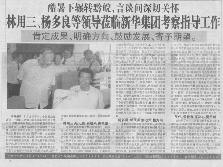 7月5日,《安徽市場報》報道:“林用三、楊多良等領導蒞臨新華集團考察指導工作”的新聞,敬請關注!