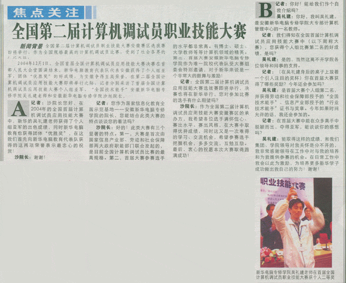 2004年12月1日,全國首屆全國計算機調(diào)試員應用技能大賽決賽在首都北京人民大會堂圓滿結(jié)束。新華電腦教育代表隊代表安徽獲得了個人組亞軍,團體“優(yōu)勝獎”的好成績,為安徽爭得至高榮譽。在第二屆全國計算機調(diào)試員應用技能大賽即將舉行之際,記者分別采訪了首屆全國計算機調(diào)試員應用技能大賽個人組亞軍、“全國技術能手”安徽新華電腦專修學院吳禮建老師和安徽新華電腦專修學院沙旭院長,以下采訪記錄: