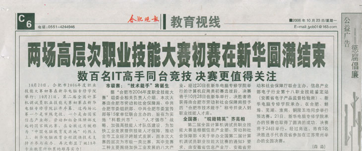 10月23日,《合肥晚報》C6版報道:“兩場高層次職業技能大賽初賽在新華圓滿結束”, 敬請關注!