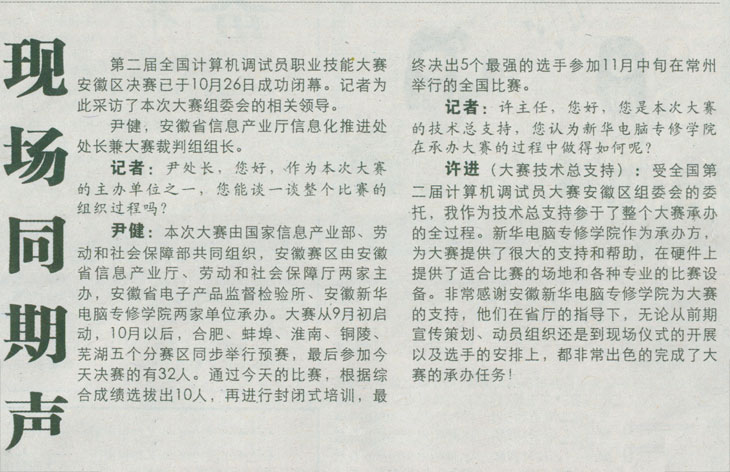 當前位置:首頁 > 新聞中心 > 青春新華 > 《合肥晚報》報道:全國第二屆計算機調試員大賽現場同期聲
