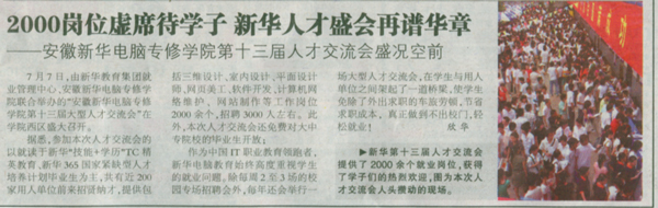 7月10日,《安徽市場報》報道:“2000崗位虛待學子 新華人才盛會譜華章——安徽新華電腦專修學院第十三屆人才交流會盛況空前 ”,敬請關注!