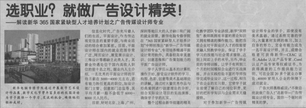 10月9日,《安徽商報》報道:“選職業?就做廣告設計精英!——解讀新華365國家緊缺型人才培養計劃之廣告傳媒設計師專業”,敬請關注!
