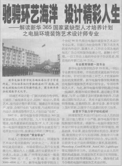10月18日,《合肥晚報(bào)》報(bào)道:“馳騁環(huán)藝海洋 設(shè)計(jì)精彩人生——解讀新華365國家緊缺型人才培養(yǎng)計(jì)劃之電腦環(huán)境裝飾藝術(shù)設(shè)計(jì)師專業(yè)”,敬請關(guān)注!