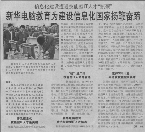 9月25日,《中國青年報》報道:“信息化建設(shè)遭遇技能型IT人才‘瓶頸’——新華電腦教育為建設(shè)信息化國家揚(yáng)鞭奮蹄”!