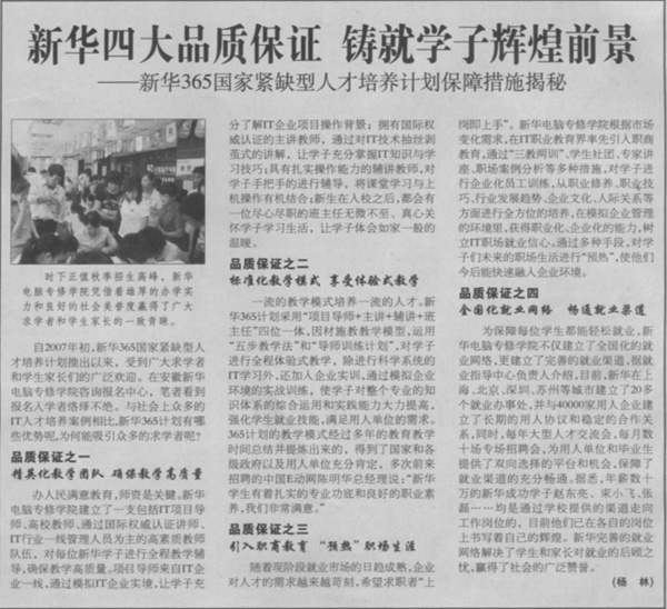 9月26《中國青年報》報道:“新華四大品質保證 鑄就學子輝煌前景——新華365國家緊缺型人才培養計劃保障措施揭秘”,敬請關注!