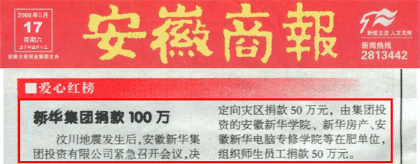 時(shí),由集團(tuán)投資的安徽新華學(xué)院、新華房產(chǎn)、安徽新華電腦專修學(xué)院等在肥單位,主動(dòng)組織師生員工向地震災(zāi)
