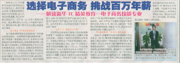 當前位置:首頁 > 新聞中心 > 青春新華 > 《合肥晚報》報道:選擇電子商務 挑戰百萬年薪
