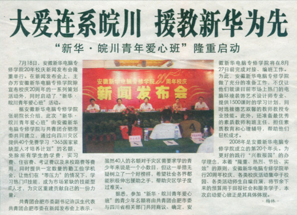 當(dāng)前位置:首頁 > 新聞中心 > 青春新華 > 安徽市場報報道:大愛連系皖川 援教新華為先