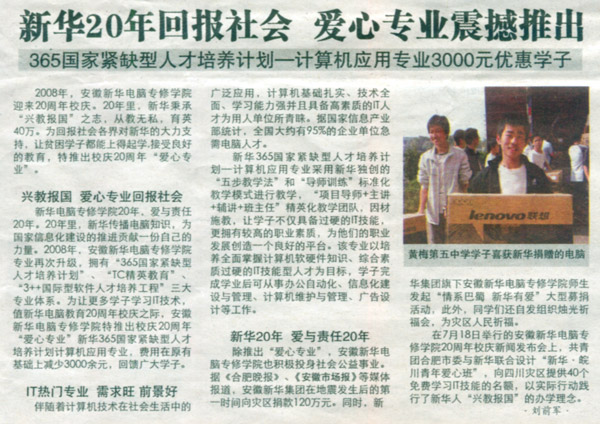 當(dāng)前位置:首頁 > 新聞中心 > 青春新華 > 安徽市場報(bào)報(bào)道:新華20年回報(bào)社會 愛心專業(yè)震撼推出