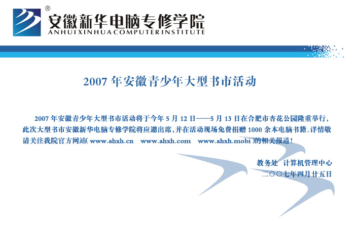 當前位置:首頁 > 新聞中心 > 通知通告 > 2007年安徽青少年大型書市活動