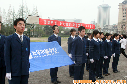 4月1日,新華電腦專修學院大專部儀仗隊的颯爽英姿走過主席臺的時候,標志著安徽新華電腦專修學院大專部“講文明話,做文明事,爭做文明人”萬人簽名活動的正式開始。