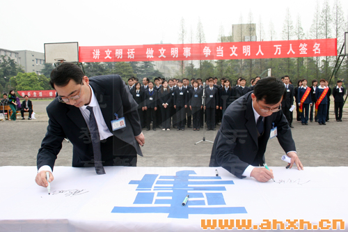 繼本次簽名儀式后,安徽新華電腦專修學院還將通過校會、班會、網站、校報、廣播、板報等形式和渠道對全院師生進行更深入的宣傳和教育,層層發動,提高認識,落實行動,借第二屆新華數字藝術節之東風,繼續開展創建“文明寢室”、“文明班組”和“文明校園”的評比活動。