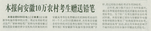 《中國青年報》報道:“向安徽10萬農村考生贈送鉛筆”