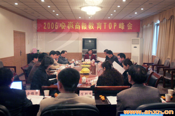 11月23日,由安徽商報社主辦的2006年安徽商報教育TOP峰會暨“安徽省教育培訓機構品牌宣言”活動在安徽日報社隆重召開。省人事廳人才培訓中心培訓部部長史培剛、合肥市教育局宣教處處長楊德東、《安徽商報》社社長周彪、合肥工業大學經濟學教授劉志迎、新華電腦專修學院副院長楊東風以及省內各大培訓教育機構代表三十多人應邀出席。