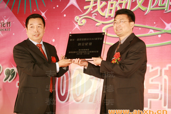 晚會上,新華教育集團教育發展研究院項目經理陳映年宣讀新華•CEAC獎學金設立文件,國家信息化CEAC認證管理辦公室主任張方向沙旭院長授牌,新華•CEAC獎學金是由CEAC每年出資20萬元在新華“365國家緊缺型人才培養計劃”和“技能+學歷教TC精英教育”兩大專業體系中設立專項獎學金,對優秀學子進行嘉獎,這也是新華繼新華•微軟獎學金、Adobe專項獎學金后設立的第三項獎學金。