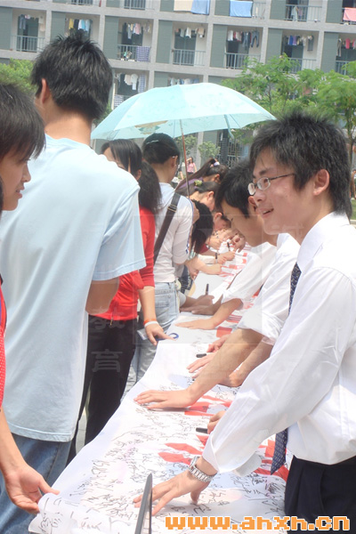上午9時,簽名活動在院西區和大學部正式開始,學院相關部門領導在簽名活動上希望同學們以一顆感恩的心投入到學習中去,以優異的學習成績回報母親并率先在調幅上簽下自己的名字。