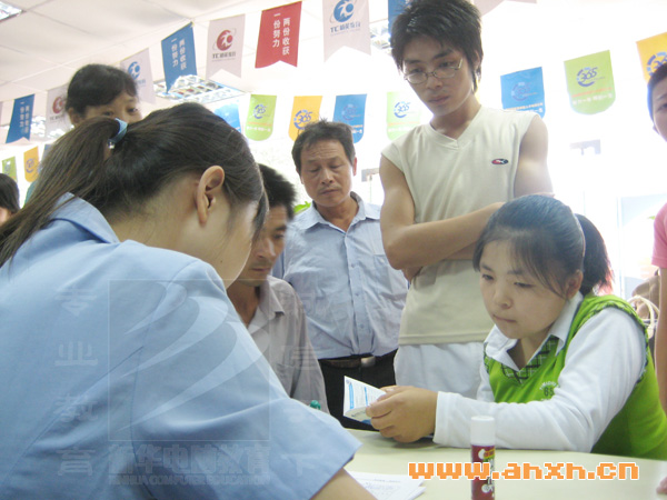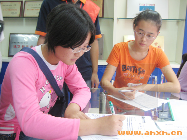 咨詢臺左邊,三個年齡相仿的女孩聊的不亦樂乎。原本以為她們也是相識,結伴報名。細問之下才知道,張文莉來自安徽臨泉,劉玲玲來自河南,而來自阜陽的汪志藍卻是今年已經畢業了的。她們是怎樣結識的呢?