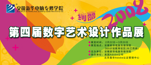 新華電腦專修學院第四屆數字藝術設計作品展將于2008年2月22日上午在365計劃教育校區(長江西路)正式開幕。此次以“絢麗2008”為主題的作品展共展出作品800余幅,其中我院學子作品近700幅,Adobe公司“中國風”07年度Shall We Dance數字藝術大賽獲獎作品110余幅。作品分為平面設計、三維室內外效果表現、3D產品造型、卡通畫、網頁設計五大類,分別設立Adobe公司作品展區 、我院學生作品展區和“榜樣,你好”活動成果展區。其中,“榜樣,你好”活動成果展區展示了我院在2007年“榜樣,你好”——第九期優秀學子評選活動中,表現優異的100名在校生青春勃發的形象。我們不僅能看到他們驕人的成績,更能看到他們身上優秀的道德品質,刻苦的學習精神。所以,此次展覽不僅為廣大學子提供了一個接觸國內外數字藝術領域的渠道,更為他們提供了展示自我、檢驗學習成果的良好機會。在此,熱誠歡迎社會各界人士蒞臨現場參觀交流并提出寶貴的意見,屆時安徽新華電腦專修學院網站(m.wchaoz.com)也將全程現場直播,敬請關注!
