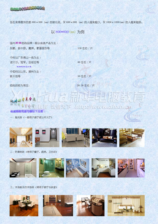 E軒文學(xué)社首先在本社團(tuán)組織了以新華—電腦環(huán)境裝飾藝術(shù)設(shè)計(jì)師專業(yè)同學(xué)為主的團(tuán)隊(duì)。他們分工明確,責(zé)任到人,分為三組進(jìn)行地磚知識(shí)的整理。一組通過網(wǎng)絡(luò)的形式搜索地磚內(nèi)容;二組負(fù)責(zé)整理課程中的地磚知識(shí);最后一組負(fù)責(zé)咨詢專業(yè)老師進(jìn)一步了解地磚知識(shí)。經(jīng)過一周的準(zhǔn)備,資料在一起有十幾頁的內(nèi)容,包括地磚的質(zhì)地、價(jià)格、規(guī)格、市場(chǎng)等,對(duì)他們的下一步工作做好了充分的準(zhǔn)備。