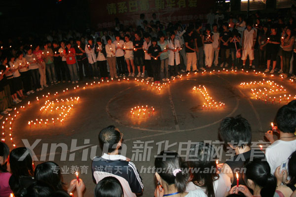 在5.12大地震發生后,他們積極響應學院的號召,踴躍地向災區人民捐款、捐物,為災區建設獻上自己的一份綿薄之力。他們還組織365計劃教育西校區的各社團進行了“情系巴蜀 新華有愛”燭光祈福會,用紅蠟燭擺起“5.12”這樣一個令人難以忘記又不愿提及的數字。操場上擠滿了參加祈福的同學,用愛心紙條、紅蠟燭這樣簡單但誠摯的方式表達他們對災區人民的祝福。燃起一支紅燭,給廢墟下的同胞帶去一份溫暖、光明和希望,給他們帶去堅持下去的勇氣和信心!