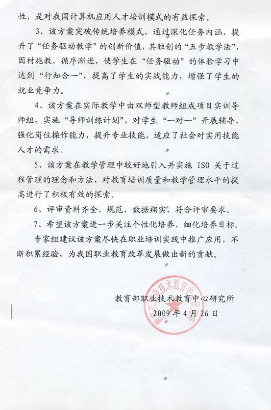 應(yīng)新華教育集團(tuán)申請,教育部職業(yè)技術(shù)教育中心研究所組織有關(guān)專家,于2009年4月26日對新華教育集團(tuán)《計算機(jī)信息類專業(yè)培養(yǎng)方案(2009版)》進(jìn)行了評審。