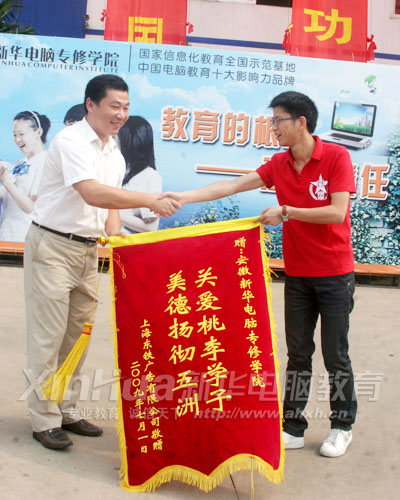 09年7月3日上午,上海東鐵廣告有限公司向安徽新華電腦專修學(xué)院贈送了錦旗。上面寫著:“關(guān)愛桃李學(xué)子 美德?lián)P徹五洲”,以表達對新華培養(yǎng)IT專業(yè)的認可和雙方良好合作的意愿。