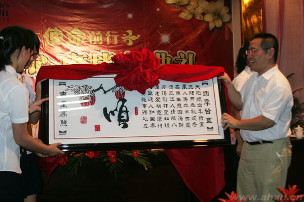 畢業典禮上,“皖川愛心班”向學習、生活了一年的母校贈送一幅蜀繡,感謝母校和恩師的教誨。學子喬雪梅在畢業感言中寫到:新華讓我知道了人間的真情,新華為我們營造了一個良好的學習環境,讓我們能夠踏踏實實的學習,也讓我明白了一個人要時刻懷有一顆感恩的心,更要有一顆真摯的愛心。我們會把安徽人民的愛帶回家鄉,愿我們的明天更加美好!