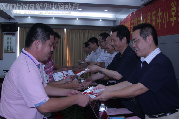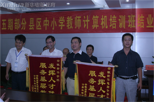 結業儀式上,省政協領導與新華的領導們共同為接受培訓的120名教師辦法結業證書,學員代表向安徽新華電腦專修學院、新華學院贈送錦旗,上面寫著“服務基層教育、發揮人才優勢”的字樣,以表達對新華免費承辦計算機培訓、以教育方式回報社會的公益之心。