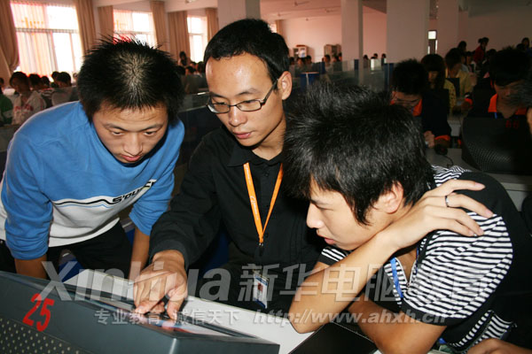 在新校區(qū),老師指導(dǎo)學(xué)子上機(jī)
