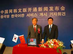 中國網(wǎng)總裁黃友義(右)和韓國明日報集團董事長張明國共同點擊開通中國網(wǎng)韓文版