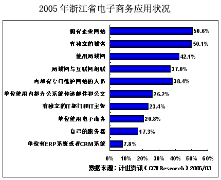 電子商務在企業流程的再造、節約、成本、提高效率、提升品牌競爭等方面發揮著巨大的作用。浙江省中小企業對電子商務的應用處于全國前列。根據計世資訊《2005-2006年浙江省中小企業信息化及電子商務應用趨勢研究報告》的調查結果顯示,有50.6%的中小企業用戶擁有自己的企業網站;有50.1%的中小企業用戶擁有自己的獨立域名;并有20.8%的企業使用了電子商務。浙江省中小企業的電子商務的應用更多的是B TO B模式,企業之間、企業與渠道之間通過網絡下訂單,進行商務活動,中小企業使用的B TO C很少,還只停留在互聯網上發布簡單信息,或者通過其他的公共電子交易平臺進行交易,而通過自己內部的網絡實現電子交易的企業非常少主要的原因之一就是中小企業普遍對網絡商業的信任程度低,另一方面用戶對這種方式的認可度也比較低。電子商務市場的發展需求多方的合作與培養。